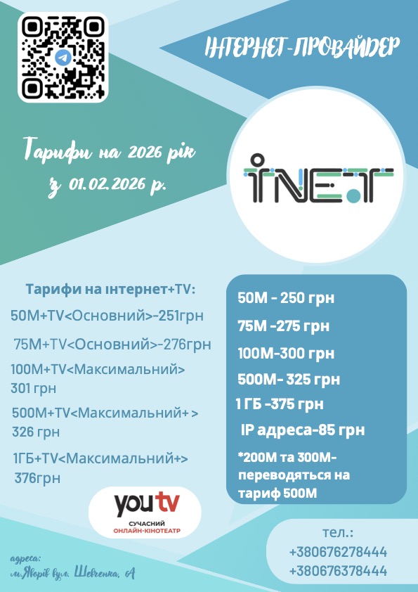 м. Яворів, вул. Шевченка 6А Пн-Пт: 9:00-18:00 inet.yv@ua.fm